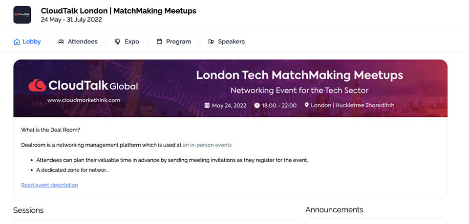 Take advantage of Deal Room, the powerful, feature-rich and cutting-edge event management platform to help you organize better events that bring value, engagement and leads to everyone.
